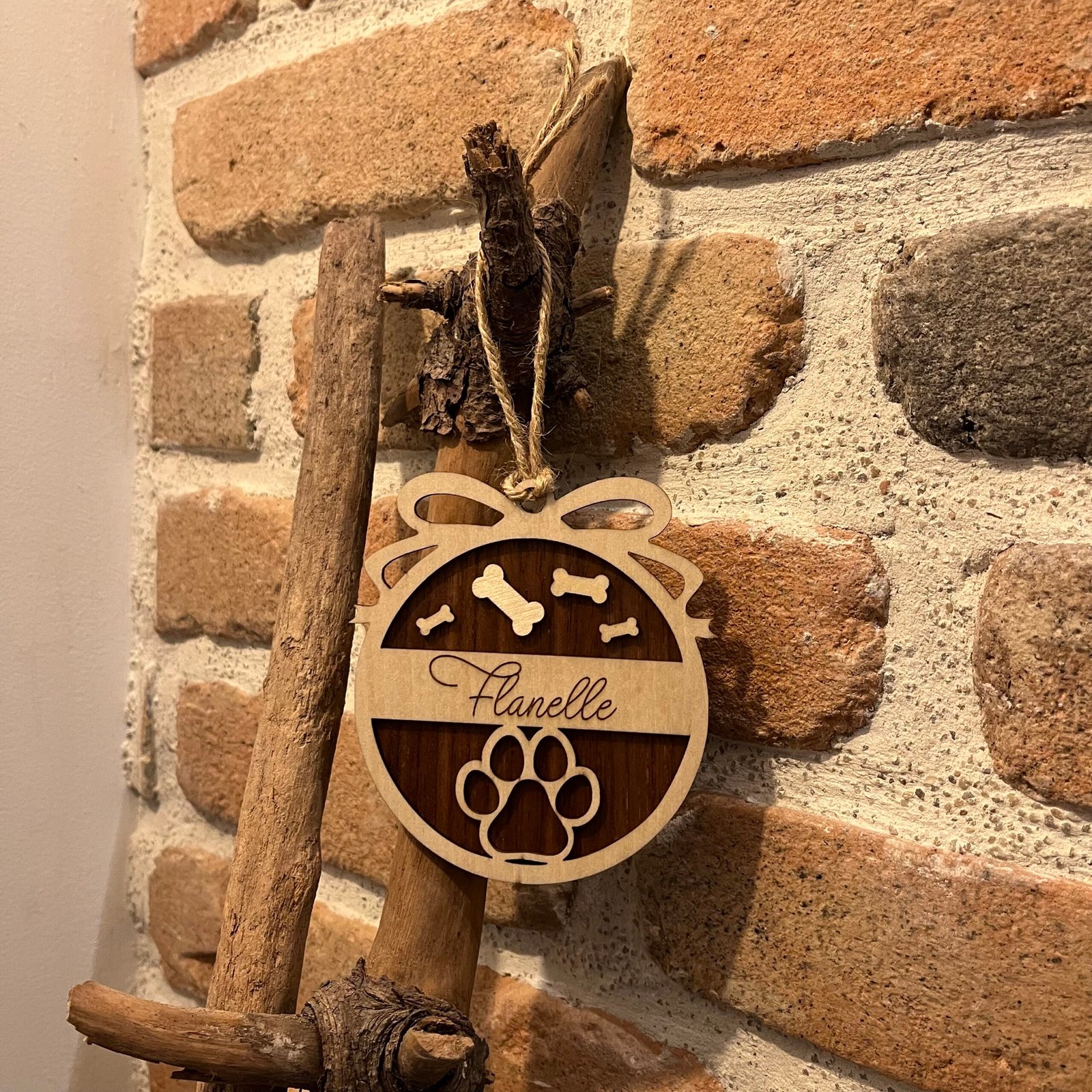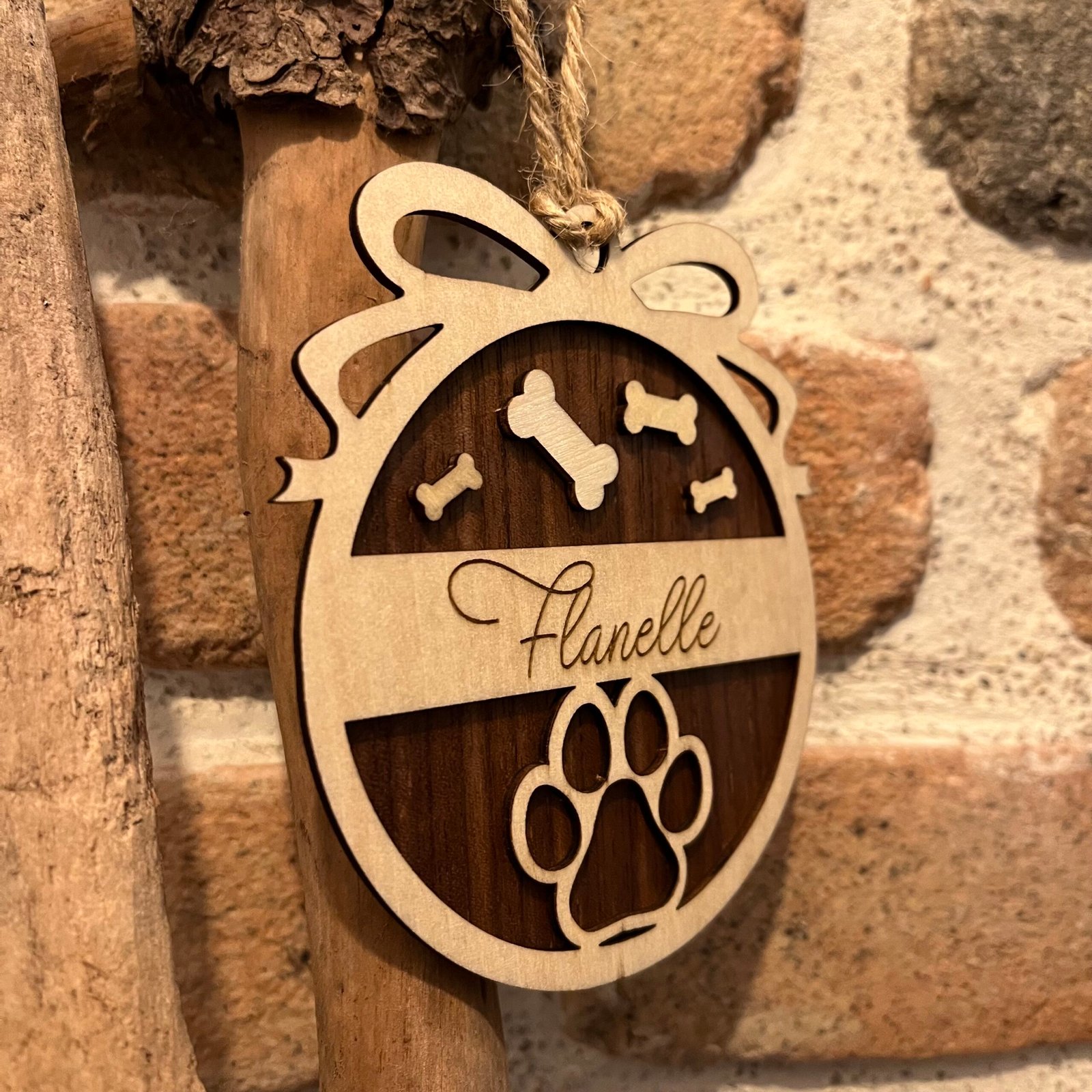Boule de Noël personnalisée en bois (noyer et tilleul) avec motif empreinte de patte et petits os, et prénom gravé au laser – diamètre 10 cm, cordelette naturelle incluse.