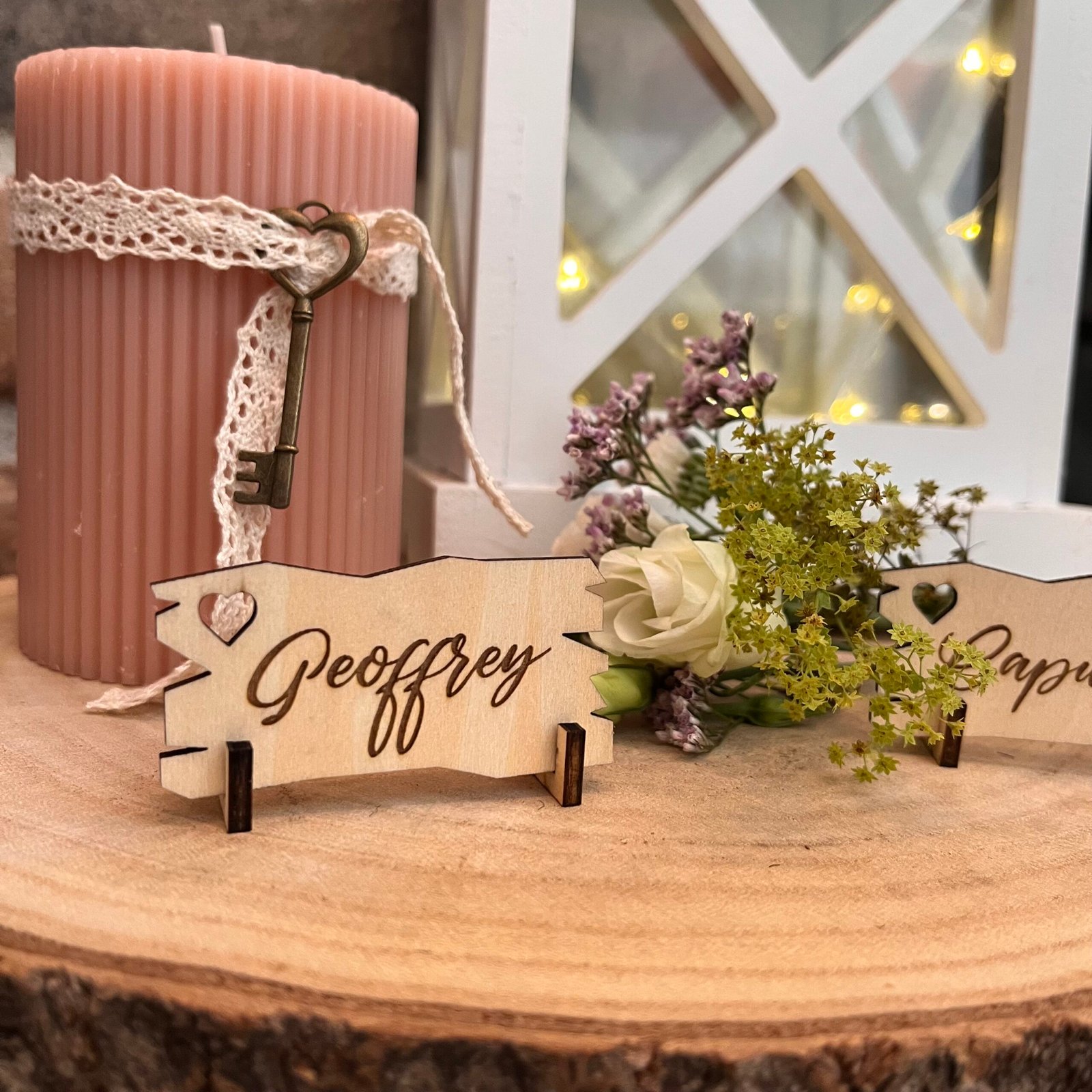 Inclus : petits cœurs en bois à remplir par les invités et insérer dans la fente