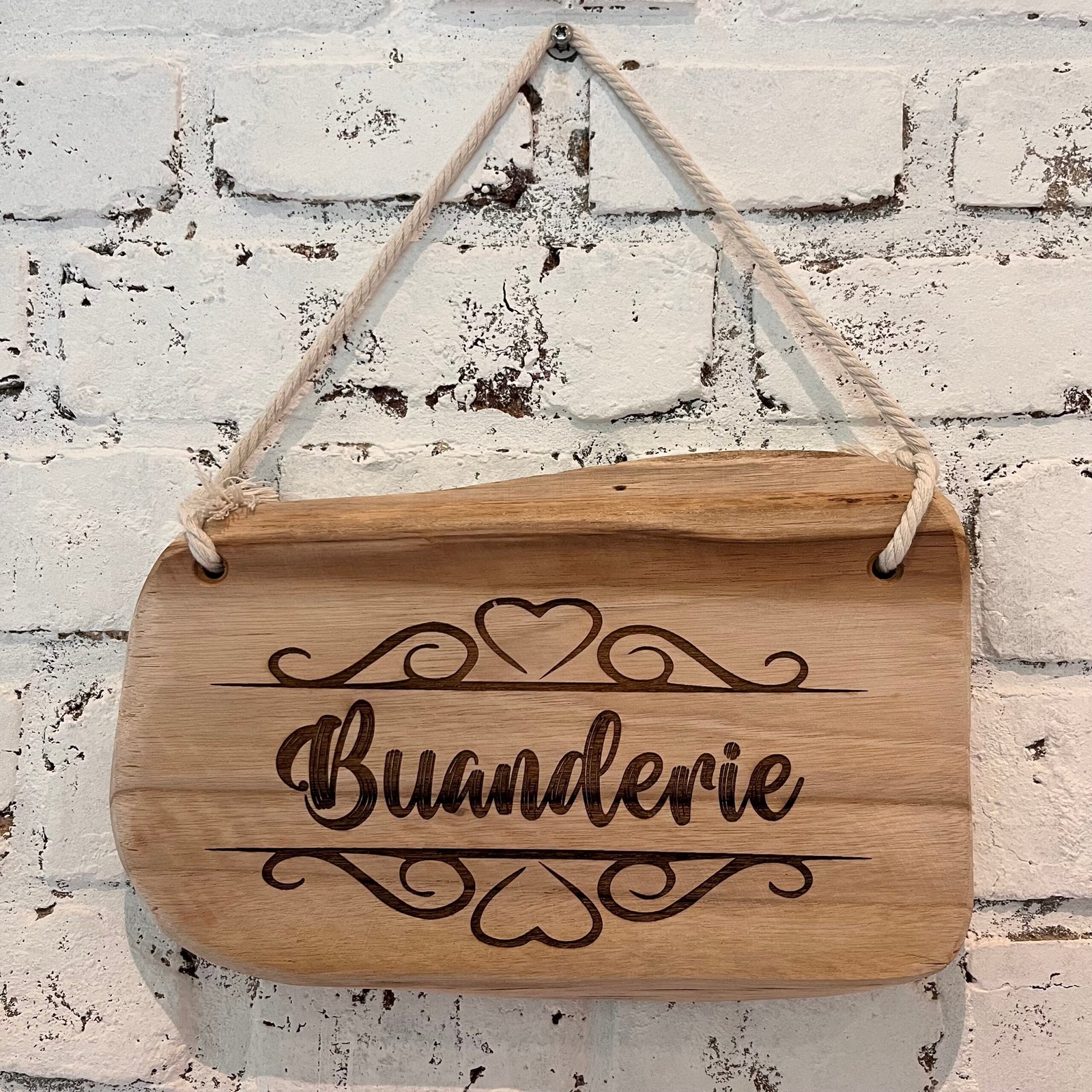 Réalisée par mes soins, cette pancarte associe un fond en noyer riche et chaleureux à un lettrage en tilleul clair, créant un contraste élégant et naturel. Une finition vernie protège et sublime le bois, garantissant durabilité et éclat. Grâce à sa cordelette naturelle, elle s’accroche facilement dans une entrée, un salon, une chambre ou même près de l’espace réservé à vos animaux.