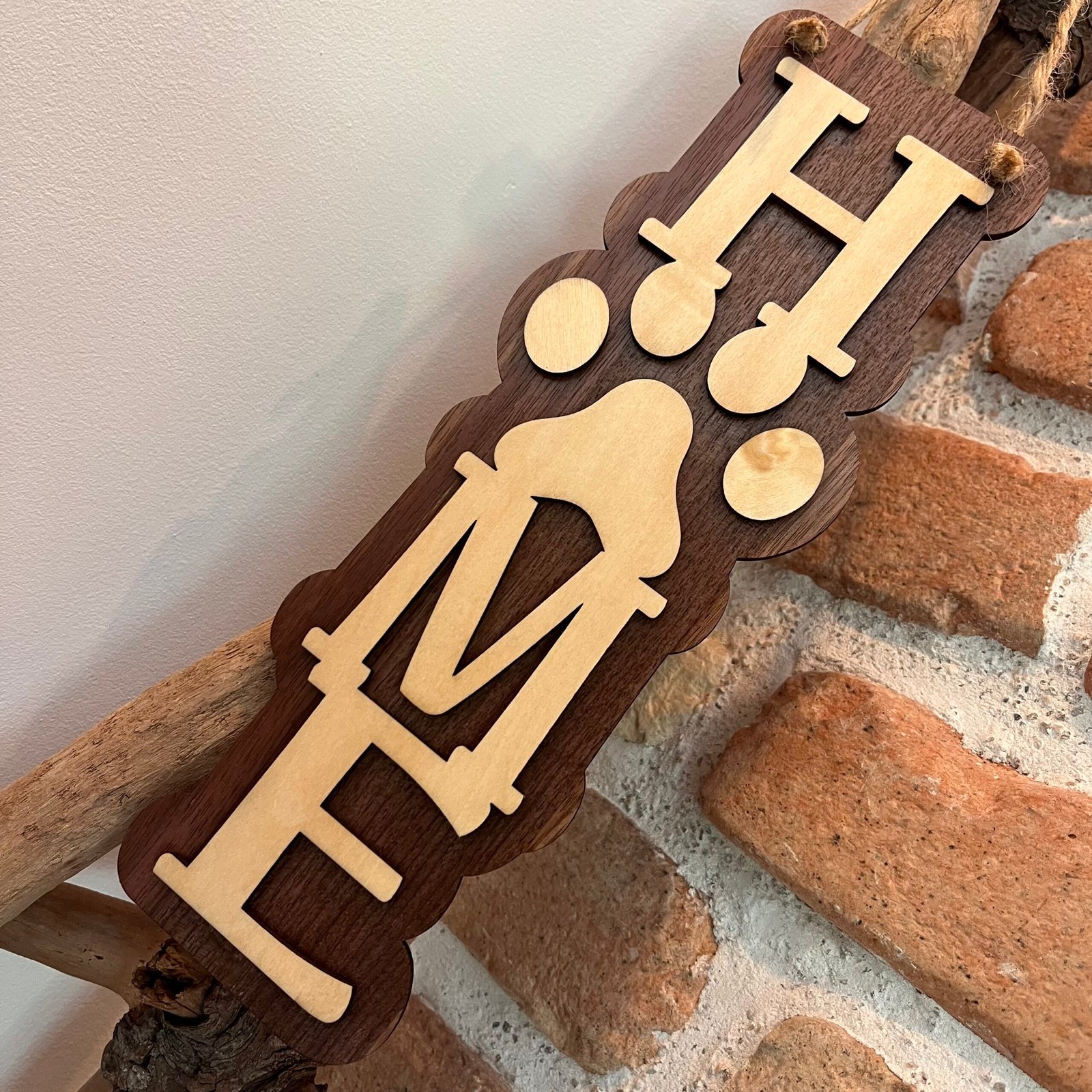 Un lettrage en tilleul, plus clair, qui contraste parfaitement avec le noyer. Son aspect doux et lumineux fait ressortir chaque détail du mot « HOME » et de la patte.
